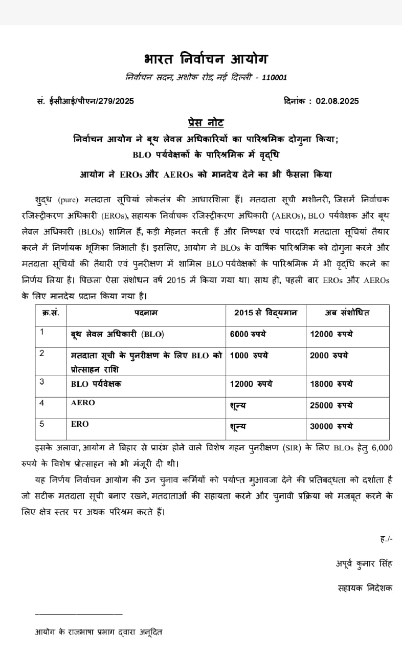 - बीएलओ पर्यवेक्षक, ईआरओ और एईआरओ के मानदेय में भी बढ़ोतरी।