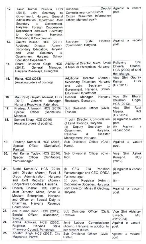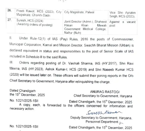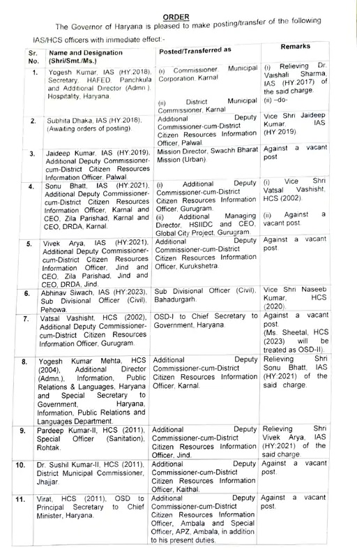 IAS Transfer Latest List आदेश के तहत योगेश कुमार आईएएस को नगर निगम करनाल का आयुक्त एवं जिला नगर आयुक्त नियुक्त किया गया है। आईएएस सुभिता ढाका को पलवल में अतिरिक्त उपायुक्त-सह-जिला नागरिक संसाधन सूचना अधिकारी की जिम्मेदारी दी गई है। वहीं आईएएस जयदीप कुमार को स्वच्छ भारत मिशन (अर्बन) का मिशन डायरेक्टर बनाया गया है। इसके अलावा कई एचसीएस अधिकारियों को भी नई पोस्टिंग मिली है।