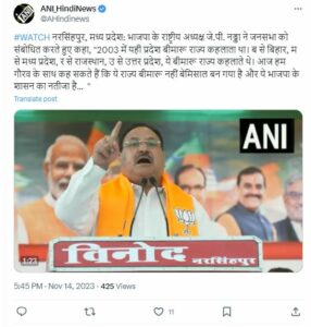 JP Nadda Raisen Visit: रायसेन। मध्यप्रदेश और छत्तीसगढ़ में 17 नवंबर को मतदान होने हैं। मतदान को केवल दो दिन रह गए हैं। ऐसे में सभी पार्टियां जोरो-शोरो से प्रचार-प्रसार में लगी हुई है। इसी बाच आज देश के प्रधानमंत्री नरेंद्र मोदी सहित पार्टी के तमाम सारे दिग्गज एमपी-सीजी के दौरे पर है। इसी कड़ी में आज बीजेपी राष्ट्रीय अध्यक्ष जगत प्रकाश नड्डा रायसेन पहुंचे। यहां उन्होंने बीजेपी प्रत्याशी सुरेंद्र पटवा के पक्ष में सभा को सम्बोधित कर रहें है।