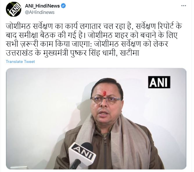 जोशीमठ सर्वेक्षण का कार्य लगातार चल रहा है, सर्वेक्षण रिपोर्ट के बाद समीक्षा बैठक की गई है। जोशीमठ शहर को बचाने के लिए सभी ज़रूरी काम किया जाएगा: जोशीमठ सर्वेक्षण को लेकर उत्तराखंड के मुख्यमंत्री पुष्कर सिंह धामी, खटीमा
