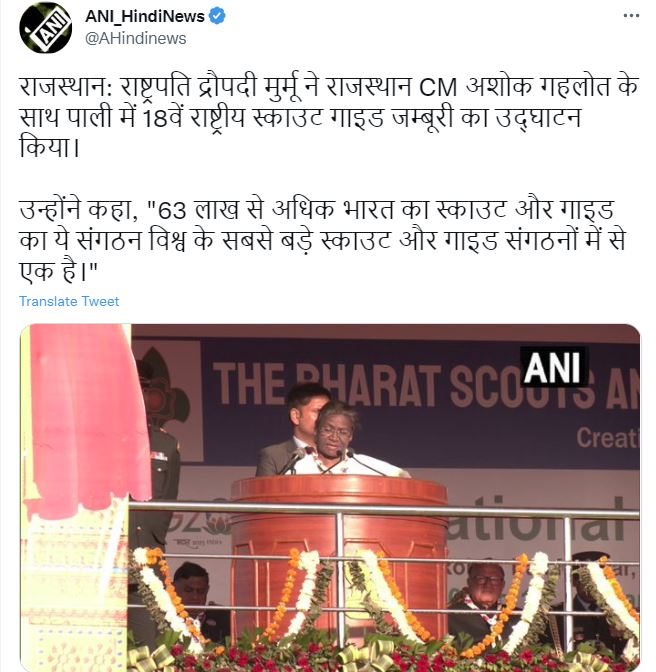 राजस्थान: राष्ट्रपति द्रौपदी मुर्मू ने राजस्थान CM अशोक गहलोत के साथ पाली में 18वें राष्ट्रीय स्काउट गाइड जम्बूरी का उद्घाटन किया। उन्होंने कहा, "63 लाख से अधिक भारत का स्काउट और गाइड का ये संगठन विश्व के सबसे बड़े स्काउट और गाइड संगठनों में से एक है।"