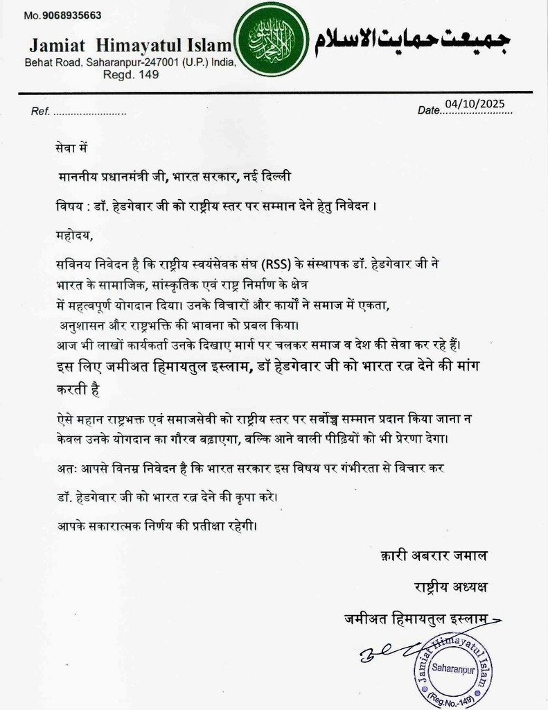 Bharat Ratna for Dr Hedgewar: इस पत्र में राष्ट्रीय अध्यक्ष अबरार जमाल ने लिखा है कि, ‘सविनय निवेदन है कि राष्ट्रीय स्वयंसेवक संघ (RSS) के संस्थापक डॉ. हेडगेवार जी ने भारत के सामाजिक, सांस्कृतिक एवं राष्ट्र निर्माण के क्षेत्र में महत्वपूर्ण योगदान दिया। उनके विचारों और कार्यों ने समाज में एकता, अनुशासन और राष्ट्रभक्ति की भावना को प्रबल किया। आज भी लाखों कार्यकर्ता उनके दिखाए मार्ग पर चलकर समाज व देश की सेवा कर रहे हैं। इस लिए जमीअत हिमायतुल इस्लाम, डॉ हेडगेवार जी को भारत रत्न देने की मांग करती है”
