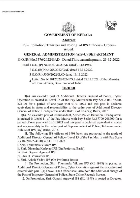 Kerala IAS officers transferred and promoted Latest News : जारी आदेश के तहत केरल के 1998 बैच के आईपीएस अधिकारी को एडीजीपी रैंक पर प्रमोशन दिया गया है। जिन अधिकारियों को एडीजीपी रैंक पर प्रमोट किया गया है। उनमें थुम्मला विक्रम, दिनेंद्र कश्यप (प्रोफार्मा प्रमोशन), गोपेश अग्रवाल, एच वेंकटेश, अशोक यादव (प्रोफार्मा प्रमोशन) शामिल हैं।