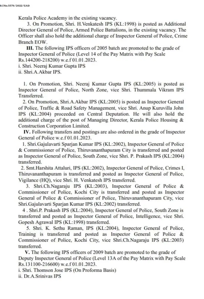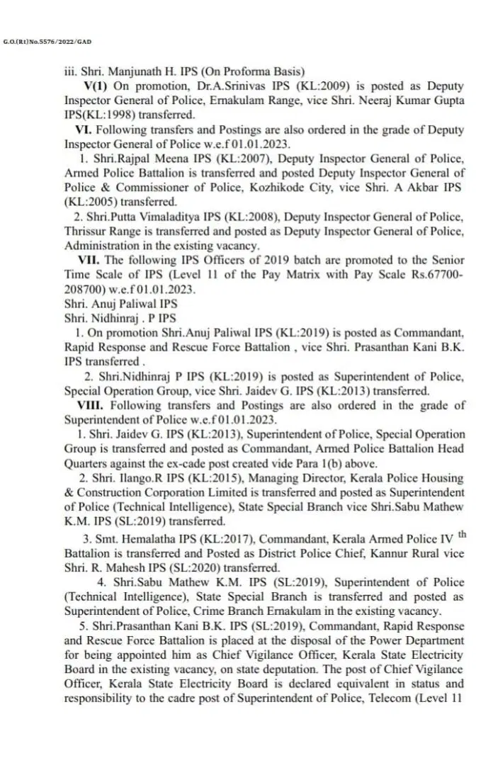 - हर्षिता अट्टालुरी , आईजीपी, अपराध, तिरुवनंतपुरम का तबादला कर आईजीपी, सतर्कता (मुख्यालय) के रूप में पदस्थापना दी है।