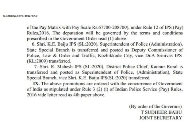 - के ई बैजू, जिला पुलिस प्रमुख, कन्नूर ग्रामीण का तबादला कर एसपी, प्रशासन, राज्य विशेष शाखा के रूप में पदस्थापना दी है।