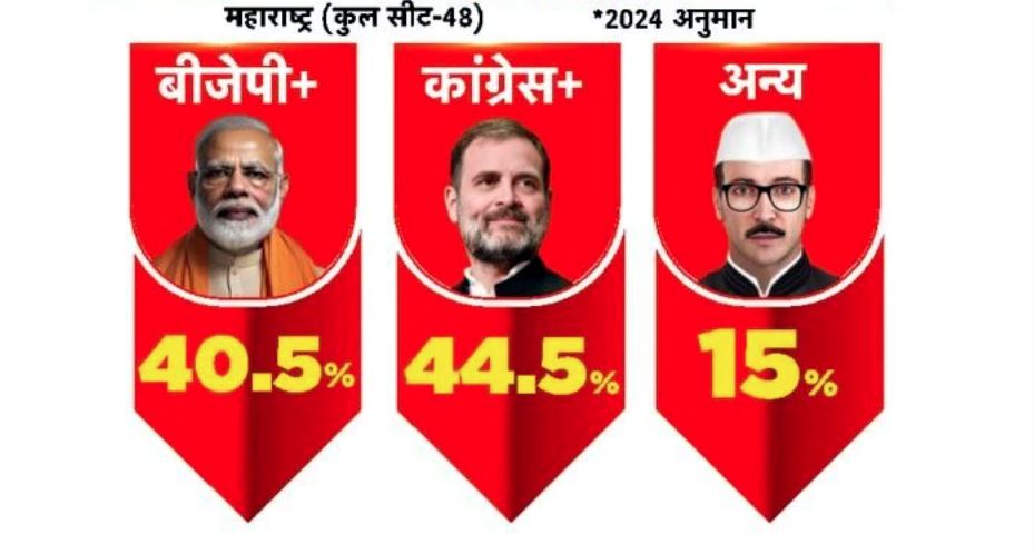 MoTN के सर्वे के मुताबिक़ बीजेपी गठबंधन को महाराष्ट्र में 22 सीटें मिलने का अनुमान लगाया गया है, जबकि 2019 में बीजेपी ने अकेले 23 लोक सभा सीटों पर जीत हासिल की थी। ये तब की बात है जब शिवसेना टूटी नहीं थी, और बीजेपी के साथ उसका गठबंधन, जिसमें 19 सीटों पर जीत मिली थी। बीजेपी गठबंधन का मुकाबला कांग्रेस और एनसीपी गठबंधन से था, जिसमें दोनों के हिस्से में 6 सीटें आई थी। तब एनसीपी में भी कोई टूट नहीं हुई थी और उसे 4 सीटें मिली थीं, जबकि कांग्रेस को 2 सीटें – और औरंगाबाद की एक सीट असदुद्दीन ओवैसी की पार्टी AIMIM को मिली थी।