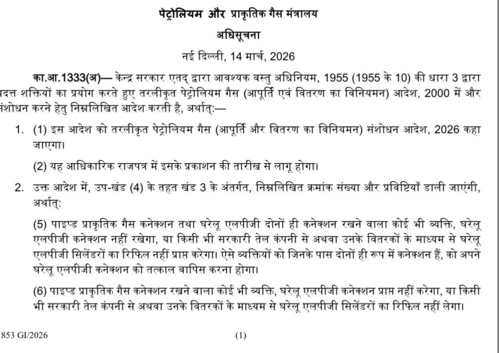 मंत्रालय ने अपने आदेश में कहा, ”कोई भी व्यक्ति जिसके पास पाइप वाली प्राकृतिक गैस (PNG) का कनेक्शन है और जिसके पास घरेलू एलपीजी कनेक्शन भी है, वह घरेलू एलपीजी कनेक्शन अपने पास नहीं रखेगा, और न ही किसी सरकारी तेल कंपनी से, या उनके वितरकों के माध्यम से, घरेलू एलपीजी सिलेंडरों की रिफिल लेगा। ऐसे व्यक्तियों के लिए यह आवश्यक होगा कि वे अपने घरेलू एलपीजी कनेक्शन को तत्काल समर्पित कर दें।” सरकार का कहना है कि यह फैसला मौजूदा ऊर्जा आपूर्ति की स्थिति को ध्यान में रखते हुए लिया गया है। पश्चिम एशिया में चल रहे संकट के कारण वैश्विक स्तर पर ऊर्जा आपूर्ति प्रभावित हुई है, जिसके चलते घरेलू गैस वितरण व्यवस्था को संतुलित करने के लिए यह कदम उठाया गया है।