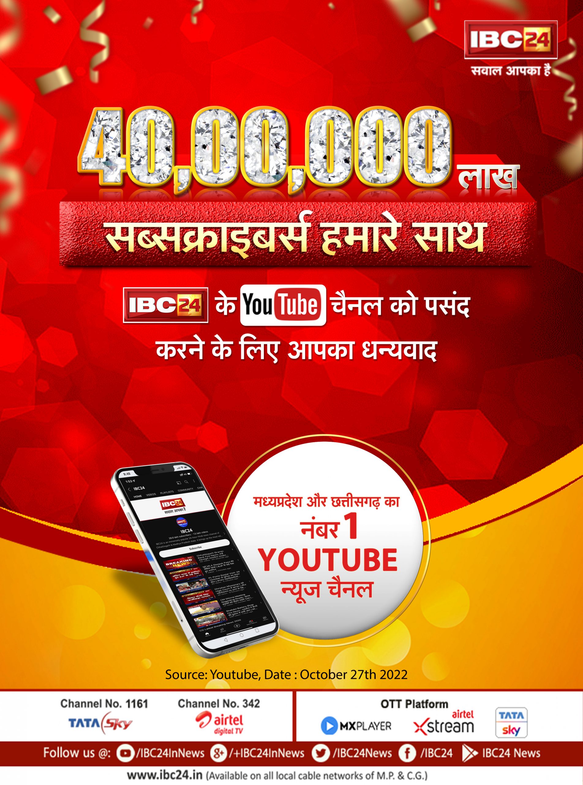 IBC24 YOUTUBE Subscribers : मध्य प्रदेश और छत्तीसगढ़ के नंबर वन न्यूज चैनल IBC24 ने आज बड़ा कीर्तिमान रचा है। IBC24 के YOU TUBE चैनल ने ....