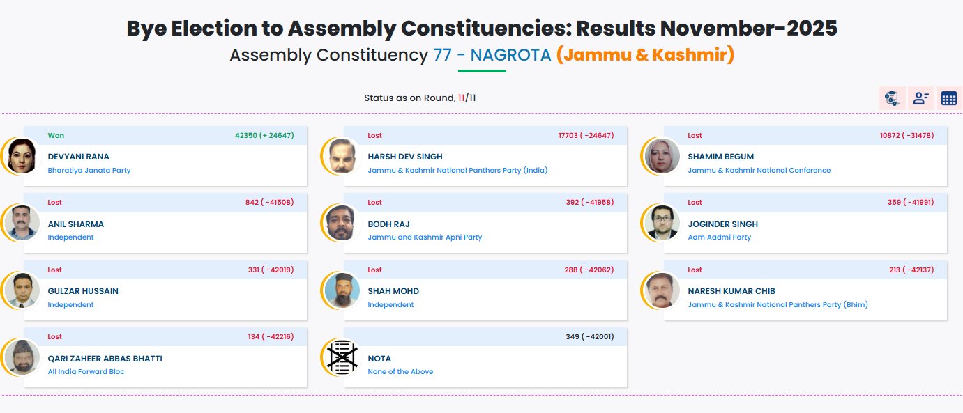 Nagrota By Election Result: इस विधानसभा क्षेत्र में कुल 97,980 मतदाता थे। 11 नवंबर को हुए मतदान में 75.08% मतदान दर्ज किया गया था। मतगणना शुक्रवार सुबह 8 बजे जम्मू के बिक्रम चौक स्थित पॉलिटेक्निक कॉलेज में शुरू हुई, जहाँ पहले ही राउंड में भाजपा उम्मीदवार ने निर्णायक बढ़त हासिल कर ली थी। देवयानी राणा की इस जीत को भाजपा की बड़ी सफलता माना जा रहा है वहीं हर्षदेव सिंह को भारी अंतर से हार झेलनी पड़ी। यह परिणाम नगरोटा की राजनीति में नया अध्याय जोड़ता है।