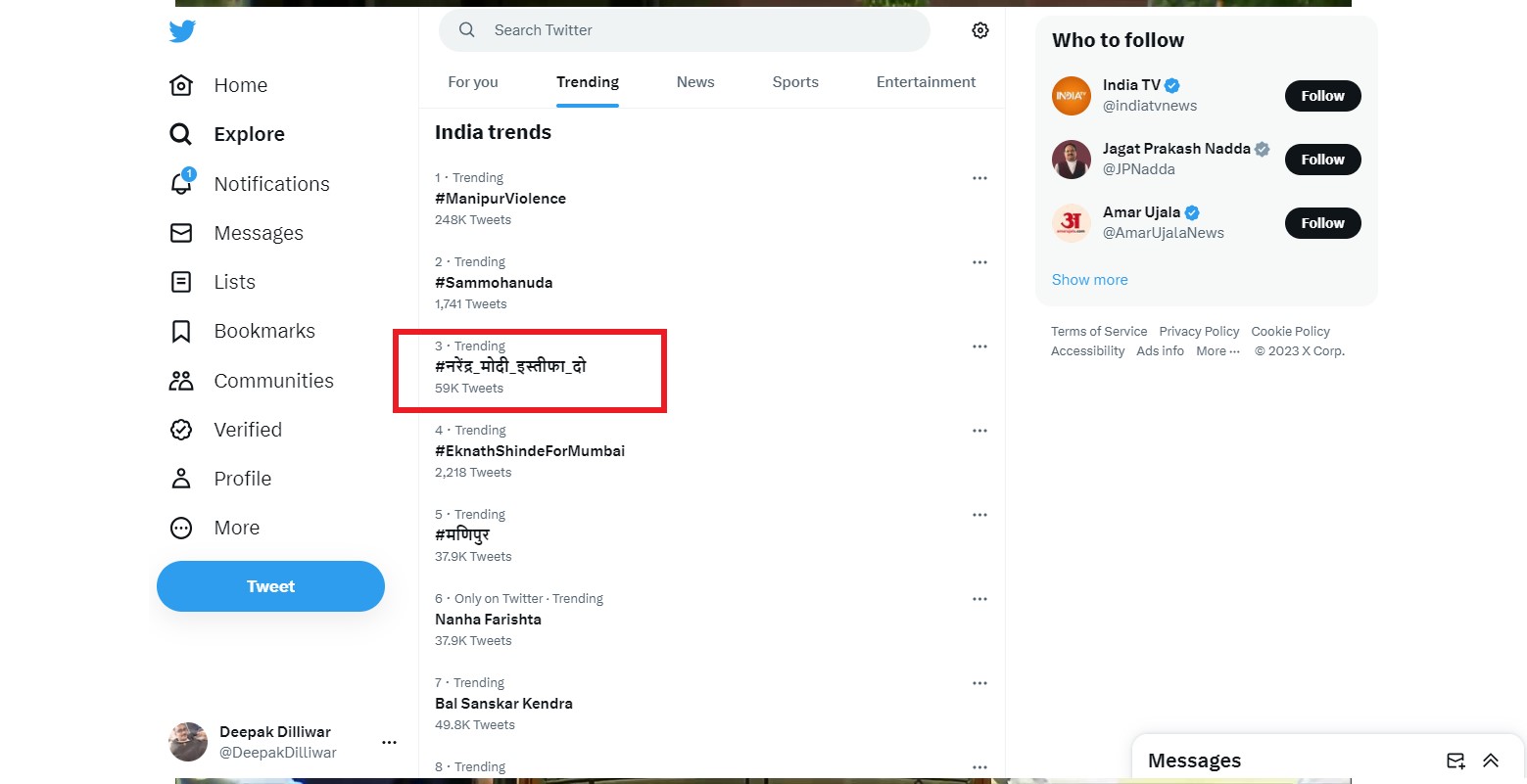 इम्फाल: #नरेंद्र_मोदी_इस्तीफा_दो मणिपुर में महिलाओं को नग्न कर सरेआम घूमाए जाने के मामले को लेकर देश में बवाल मचा हुआ है। देशभर के नेताओं की इस मामले में प्रतिक्रियाएं सामने आ रहे हैं। मुद्दा गरमाने के बाद एक बार फिर विपक्ष मोदी सरकार पर हमलावर हो गई है और पीएम मोदी से इस्तीफे की मांग कर रही है। वहीं, सोशल मीडिया पर भी #नरेंद्रमोदीइस्तीफा_दो ट्रेंड करने लगा है। हालांकि महिलाओं को नग्न कर घूमाने वाले मुख्य आरोपी को गिरफ्तार कर लिया गया है। वहीं, पुलिस की 20 टीमों को आरोपियों को गिरफ्तार करने के लिए लगाया गया है, जो सर्चिंग अभियान में लगी हुई है।