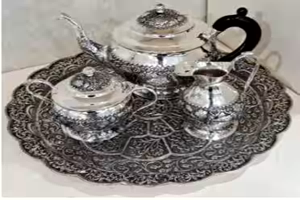 बारीक नक्काशी से बना सजावटी मुर्शिदाबाद चांदी का टी सेट, पश्चिम बंगाल की शानदार कलाकारी और भारत और रूस दोनों में चाय के गहरे सांस्कृतिक महत्व को दिखाता हैं। दोनों देशों में चाय को बहुत पसंद किया जाता है।