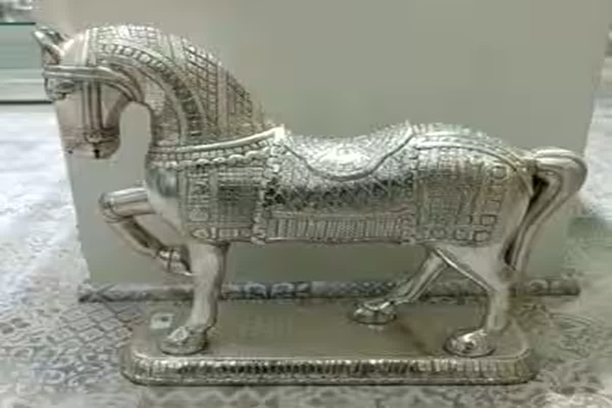 हाथ से बना चांदी का घोड़ा: बारीक नक्काशी वाला यह चांदी का घोड़ा महाराष्ट्र की धातु कला की उत्कृष्टता दर्शाता है। शौर्य और गरिमा के प्रतीक इस घोड़े का आगे बढ़ता हुआ आक्रितिक रूप भारत और रूस की निरंतर प्रगति करती साझेदारी का सुंदर रूपक प्रस्तुत करता है।
