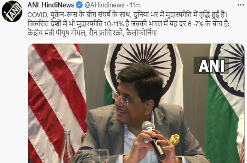 COVID, यूक्रेन-रूस के बीच संघर्ष के साथ, दुनिया भर में मुद्रास्फीति में वृद्धि हुई है। विकसित देशों में भी मुद्रास्फीति 10-11% है जबकी भारत में यह दर 6 -7% के बीच है: केंद्रीय मंत्री पीयूष गोयल, सैन फ्रांसिस्को, कैलीफोर्निया