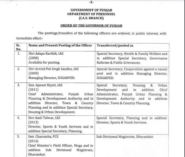 – अपनीत रियात को विशेष सचिव, हाउसिंग और अर्बन डेवलपमेंट के साथ मुख्य प्रशासक पुडा और निदेशक टाउन और कंट्री प्लानिंग का अतिरिक्त प्रभार सौंपा गया है।