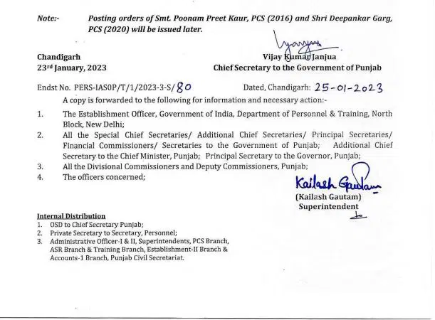 Punjab IAS Transfer 2023: राज्य शासन पंजाब द्वारा बुधवार को आदेश जारी किए गए जिसमें तत्काल प्रभाव से चार आईएस सहित 25 पीसीएस अधिकारियों की नियुक्ति आदेश जारी किए गए हैं