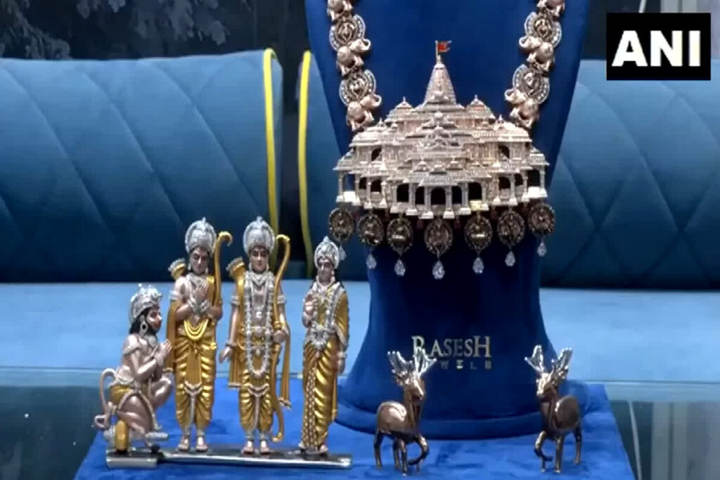 #WATCH गुजरात: सूरत में राम मंदिर की थीम पर हीरे का हार बनाया गया है।