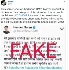 वायरल ट्वीट में यह लिखा- ‘मेरे झारखंड वासियों, आप सभी को मालूम ही होगा कि एक घातक वैरिएंट आया है, जिसका नाम ओमिक्रॉन है। आप सभी की सुरक्षा के लिए झारखंड में लॉकडाउन लगने वाला है।’