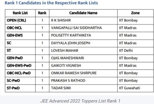उपर बताई गई लिस्ट में सारे कैटेगरी के टॉपर बताए गए हैं। इन सभी लोगो की ऑल इंडिया रैंक अलग है। आर के शिशिर ने जेईई एडवांस में टॉप किया है। उनकी ऑल इंडिया रैंक वन है। बांकी लोग कैटेगरी वाइंस रैंक होल्डर हैं। ऊपर बताऐ जोन का मतलब विद्यार्थियों के कॉलेज प्रिफरेंस से है। जिसका मतलब काउंसलिंग के बाद बच्चे इस कॉलेज में दाखिला लेंगे।