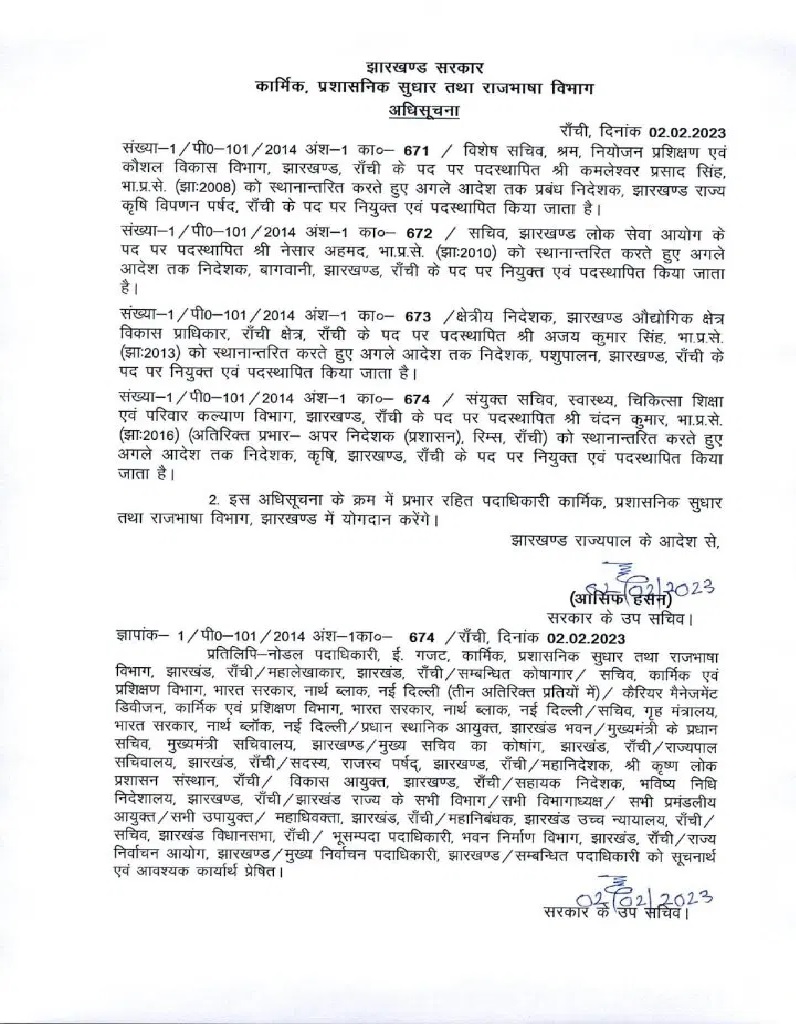 4 IAS officers transferred: नए साल की शुरुआत से ही सरकार दौरा कोई अधिकारियों के तबादले किये गए है। बता दें कि मध्य प्रदेश और छत्तीसगढ़ के बाद झारखंड में भी कई आईएएस अफसरों के तबादले कर दिए है। झारखंड राज्य की हेमंत सोरेन सरकार द्वारा जारी आदेश के अनुसार नेसार अहमद,कमलेश्वर प्रसाद सिंह सहित 4 आईएएस अधिकारियों को इधर से उधर किया है।