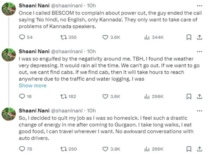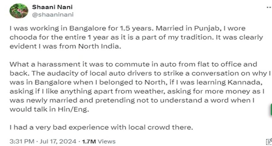 एक्स पर पोस्ट की एक सीरीज में @shaaninani नाम की महिला यूजर ने लगभग 1.5 साल बेंगलुरु में रहते हुए आई मुश्किलों के बारे में लिखा है। उन्होंने कहा, ‘मैं बेंगलुरु में डेढ़ साल से काम कर रही थी। पंजाब में शादी हुई, मैंने पूरे एक साल तक चूड़ा पहना क्योंकि यह मेरे यहां परंपरा का हिस्सा है, लेकिन यहां लोगों ने इससे बस मेरा उत्तर भारतीय होना पहचाना।’
