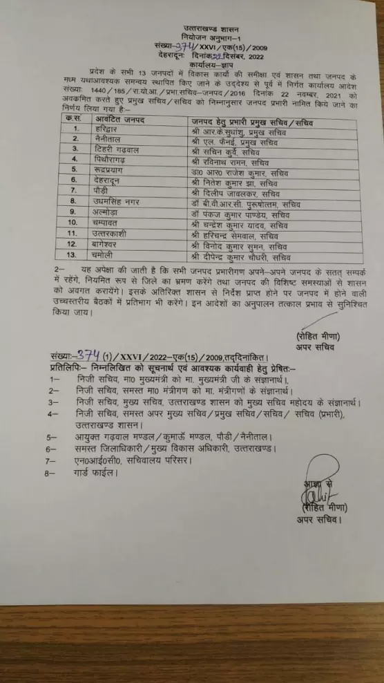 Transfer of IAS officers in Uttarakhand : जारी आदेश के तहत विकास कार्यों को गति देने और सतत निगरानी के लिए 13 वरिष्ठ आईएएस अफसरों को जिलावार प्रभारी अधिकारी नियुक्त किया गया है। वही सभी आईएएस अधिकारियों को जिले में विकास कार्यों की समीक्षा करने के निर्देश दिए गए हैं। अधिकारी सरकार और जिलों के बीच में समन्वयक भी तय करेंगे। शासन द्वारा सभी 13 जनपद में विकास कार्यों की समीक्षा और शासन और जनपद के बीच समन्वय स्थापित करने के लिए प्रमुख सचिव सचिव को नियमानुसार जनपद प्रभारी नामित किया गया है।