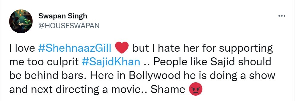 ट्विटर पर अपनी प्रतिक्रिया देते हुए एक यूजर ने कहा, “मैं शहनाज से प्यार करता हूं, लेकिन एक मी टू मुजरिम को सपोर्ट करने के लिए मुझे उनसे नफरत हो गई है..साजिद जैसे लोगों को सलाखों के पीछे होना चाहिए। यहां बॉलीवुड में वह एक शो कर रहा है और उसके बाद एक फिल्म का डायरेक्शन भी करेगा।”