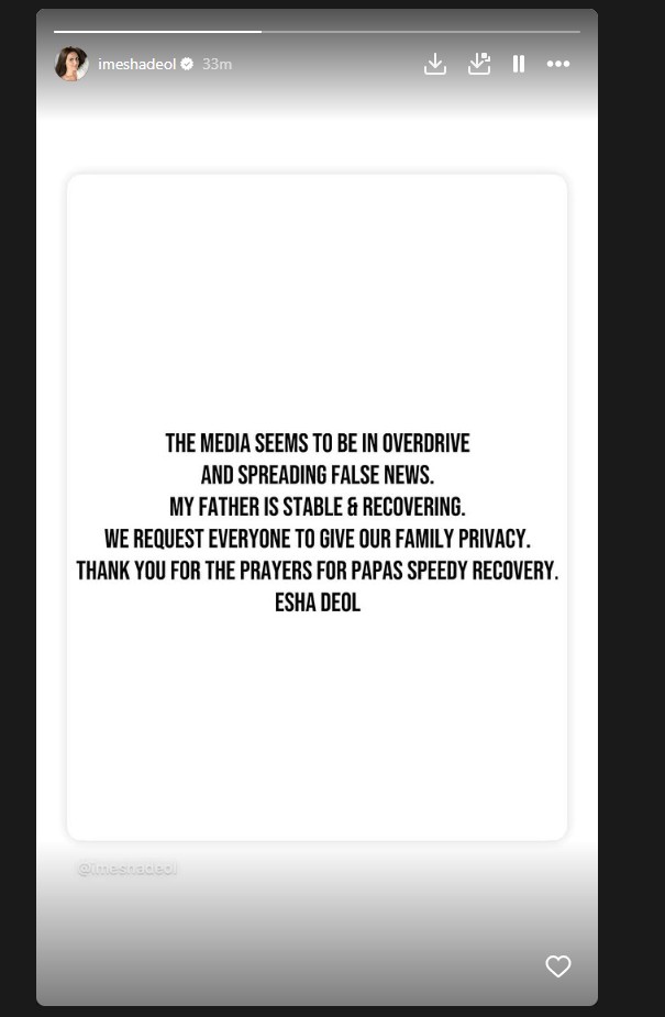 ईशा देओल ने अपने अधिकारिक इंस्टाग्राम अकाउंट की स्टोरी पर जानकारी देते हुए बताया कि ”मीडिया में मेरे पिता के निधन की अफवाह चल रही है। जबकि वो जिंदा हैं और अस्पताल में हैं। उनके स्वास्थ्य में सुधार हो रहा है। जल्द ही अस्पताल से छुट्टी मिलने की संभावना है। उन्होंने लोगों से अपील करते हुए कहा है कि अफवाह न फैलाएं।