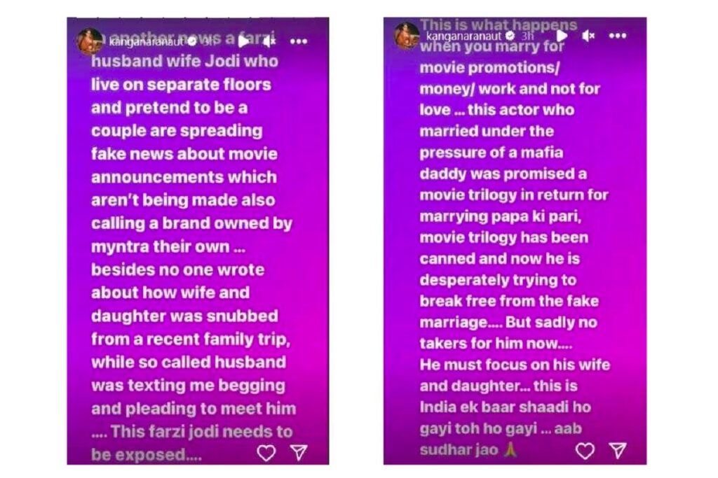 कंगना रनौत ने लिखा, “एक दूसरी खबर में फर्जी पति और पत्नी की जोड़ी जो अलग-अलग फ्लोर पर रहते हैं और कपल होने का नाटक करते हैं, फिल्म की घोषणाओं के बारे में फर्जी खबरें फैला रहे हैं, जो कि बन ही नहीं रहती हैं। इसके अलावा वह मिंत्रा के ब्रांड को अपना बता रही हैं।”