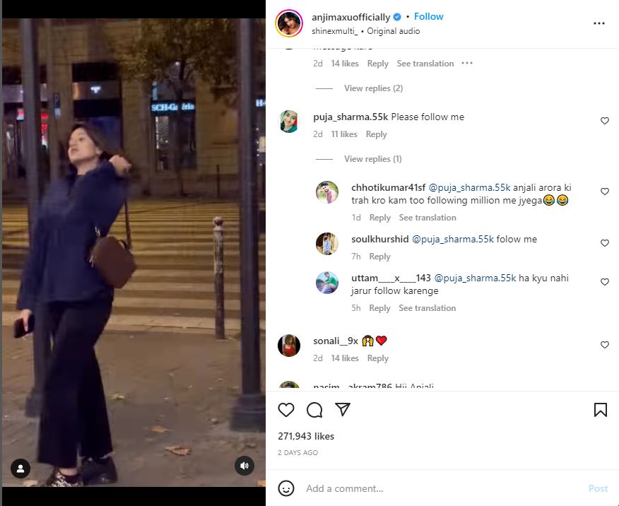 आपको बता दें कि अंजलि ने इस वीडियो को अपने इंस्टाग्राम पर शेयर किया है। अब तक इस वीडियो को 2 लाख 71 हजार से ज्यादा लोग लाइक कर चुके है और अब तक 2 हजार से ज्यादा लोग इस वीडियो पर कमेंट कर चुके है। एक यूजर ने कमेंट में लिखा है कि ”अंजलि अरोड़ा की तरह काम करोगे तो फोलोवर्स मिलियन में जाएगा।”