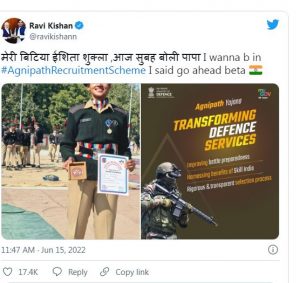 रवि किशन ने लिखा, मेरी बेटी इशिता आज सुबह बोली- पापा मैं अग्निपथ सेना भर्ती योजना में शामिल होना चाहती हूं।