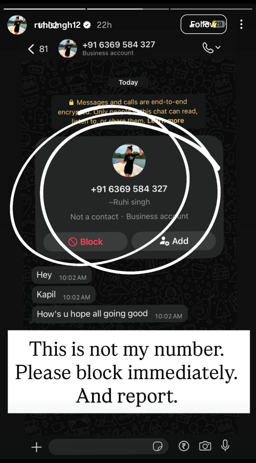 Ruhi Singh Dirty Chats Leaked: रूही सिंह ने सोशल मीडिया के जरिए अपने फैंस और फॉलोअर्स को इस धोखाधड़ी के बारे में आगाह किया। 8 फरवरी को उन्होंने अपने इंस्टाग्राम अकाउंट पर एक नोट साझा किया, जिसमें उस फर्जी व्हाट्सऐप अकाउंट की जानकारी भी दी गई। उन्होंने स्पष्ट किया कि वायरल हो रही चैट्स न तो उनकी हैं और न ही वह नंबर उनका है। अभिनेत्री ने बताया कि कोई व्यक्ति उनके नाम का इस्तेमाल कर लोगों से अश्लील और संदिग्ध संदेश भेज रहा है। उन्होंने फैंस से अपील की कि 6369584327 नंबर को तुरंत ब्लॉक और रिपोर्ट करें। साथ ही कहा कि इस मामले में वे पुलिस में शिकायत दर्ज कराने जा रही हैं।