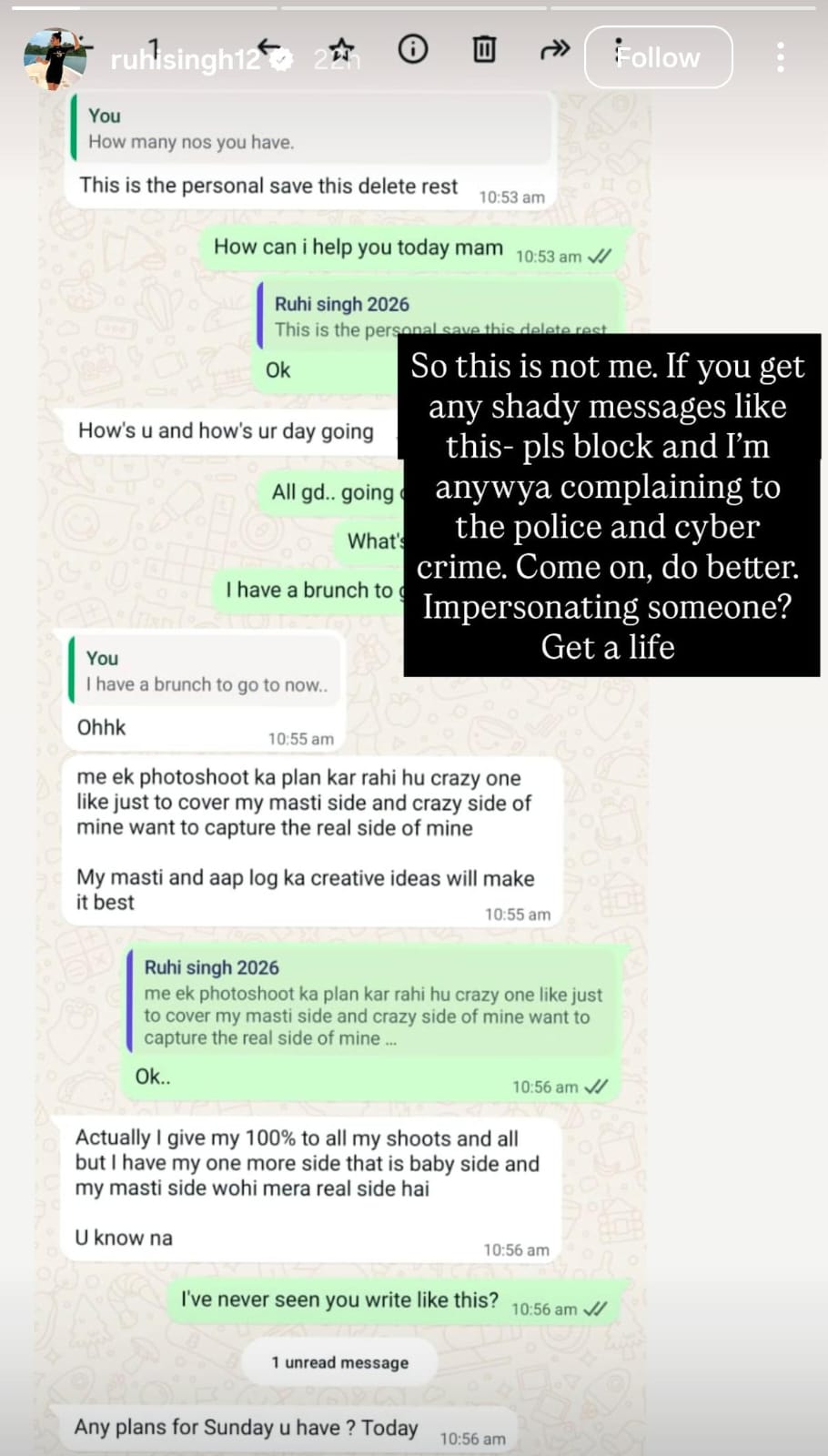 Ruhi Singh Dirty Chats Leaked: रूही ने एक स्क्रीनशॉट भी साझा किया, जिसमें फर्जी अकाउंट किसी व्यक्ति से कथित तौर पर फोटोशूट को लेकर बातचीत कर रहा था। चैट में मस्ती भरे और क्रेजी फोटोशूट जैसी बातें लिखी गई थीं जिससे लोगों को गुमराह करने की कोशिश की जा रही थी। अपनी इंस्टाग्राम स्टोरी में रूही सिंह ने साफ शब्दों में लिखा ये मैं नहीं हूं। अगर आपको मेरे नाम से कोई भी संदिग्ध मैसेज मिले तो कृपया उसे तुरंत ब्लॉक करें। उन्होंने नाराज़गी जाहिर करते हुए यह भी कहा कि किसी की पहचान चुराना? कुछ तो बेहतर करो। अपनी ज़िंदगी जियो। बता दें कि रूही सिंह एक अभिनेत्री और मॉडल हैं। उनका जन्म जयपुर में हुआ था। उन्होंने वर्ष 2015 में मधुर भंडारकर की फिल्म कैलेंडर गर्ल्स से बॉलीवुड में डेब्यू किया था। इसके बाद वे इश्क फॉरएवर और वेब सीरीज रनअवे लुगाई में नजर आ चुकी हैं।