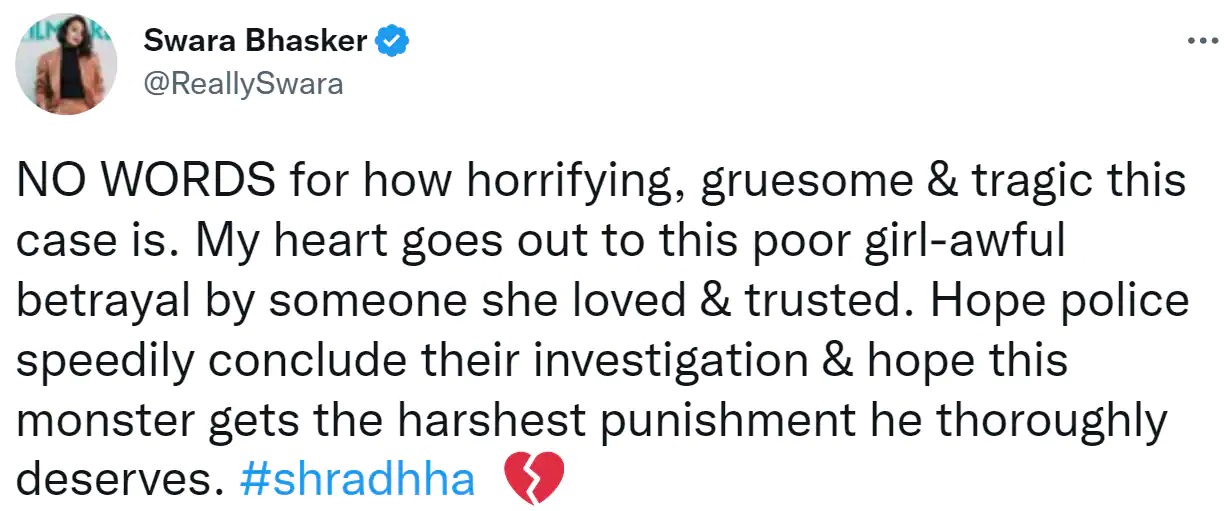 इस मामले में स्वरा ट्वीट करते हुए लिखती हैं,‘यह मामला कितना भयावह और दुखद है, इसके लिए कोई शब्द नहीं है। मेरा दिल इस बेचारी लड़की के लिए निकला जा रहा है, भयानक विश्वासघात जिसे वह प्यार करती थी और जिस पर वह भरोसा करती थी। आशा है कि पुलिस तेजी से अपनी जांच पूरी करेगी और उम्मीद है कि इस राक्षस को सख्त से सख्त सजा मिलेगी जिसका वह पूरी तरह से हकदार है।’