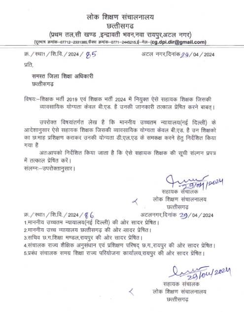 रायपुर: CG Govt will Give Chance to B-ed teacher प्राइमरी स्कूलों में बीएड डिग्री धारी सहायक शिक्षकों की नियुक्ति पर सुप्रीम कोर्ट और हाईकोर्ट का फैसला आने के बाद हड़कंप मचा हुआ है। कोर्ट के फैसले के बाद छत्तीसगढ़ के करीब 3000 शिक्षकों की नौकरी पर संकट मंडराने लगा है। हालांकि हाल ही में सीएम साय ने मीडिया से बात करते हुए कहा है कि जल्द ही इस संबंध में फैसला लिया जाएगा। वहीं, अब सोशल मीडिया पर लोक शिक्षण संचालनालय के आदेश की एक कॉपी वायरल हो रही है, जिसमें दावा किया जा रहा हे कि डीएड वाले सहायक शिक्षकों को डीएलएड करने के लिए छह महीने के लिए समय दिया जाएगा।