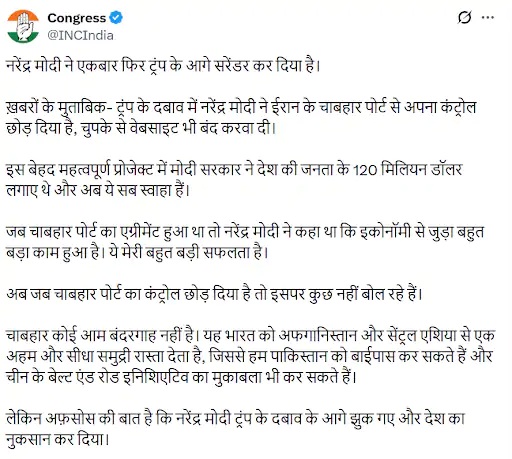 कांग्रेस ने सोशल मीडिया पर लिखा कि नरेंद्र मोदी ने एकबार फिर ट्रंप के आगे सरेंडर कर दिया है। ख़बरों के मुताबिक ट्रंप के दबाव में नरेंद्र मोदी ने ईरान के चाबहार पोर्ट से अपना कंट्रोल छोड़ दिया है, चुपके से वेबसाइट भी बंद करवा दी। इस बेहद महत्वपूर्ण प्रोजेक्ट में मोदी सरकार ने देश की जनता के 120 मिलियन डॉलर लगाए थे और अब ये सब स्वाहा हैं। जब चाबहार पोर्ट का एग्रीमेंट हुआ था तो नरेंद्र मोदी ने कहा था कि इकोनॉमी से जुड़ा बहुत बड़ा काम हुआ है। ये मेरी बहुत बड़ी सफलता है। अब जब चाबहार पोर्ट का कंट्रोल छोड़ दिया है तो इसपर कुछ नहीं बोल रहे हैं। Chabahar bandargah kis desh mein sthit hai