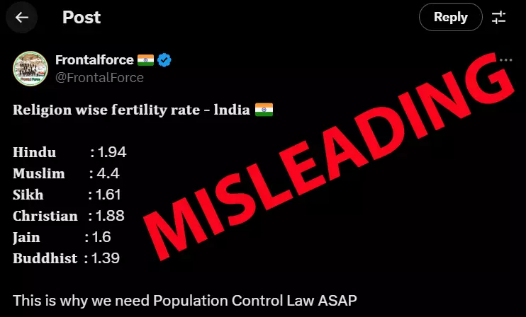 नई दिल्ली : एक्स पर एक वायरल पोस्ट भ्रामक रूप से अलग-अलग समय अवधि से धर्म के आधार पर कुल प्रजनन दर की तुलना करती है, ताकि यह झूठा दावा किया जा सके कि मुसलमानों में वर्तमान प्रजनन दर 4.4 है, जबकि हिंदुओं में यह 1.94 है। बूम ने पाया कि यह पोस्ट 1992-1993 के राष्ट्रीय परिवार स्वास्थ्य सर्वेक्षण रिपोर्ट से मुस्लिम प्रजनन दर लेकर, और इसे हिंदुओं, सिखों, ईसाइयों, जैनियों और बौद्धों के लिए 2019-2021 के आंकड़ों के साथ मिलाकर उपयोगकर्ताओं को गुमराह करती है। हिंदुओं और मुसलमानों की वर्तमान प्रजनन दर क्रमशः 1.94 और 2.36 है, जबकि सिखों, ईसाइयों, जैनियों और बौद्धों के लिए यह दर वर्तमान में क्रमशः 1.61, 1.88, 1.6, 1.39 है।