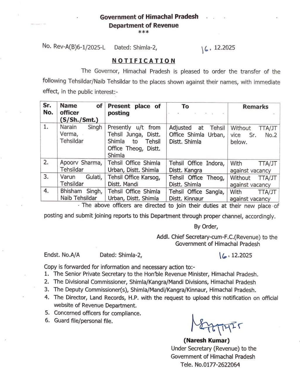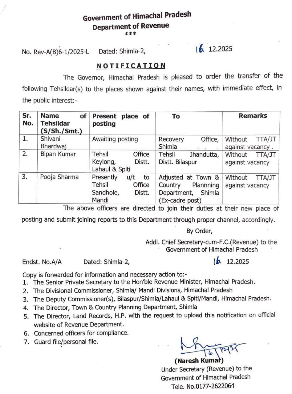 Tehsildars of Several Tehsils Replaced जारी आदेशों के अनुसार नारायण सिंह वर्मा को शिमला अर्बन का तहसीलदार नियुक्त किया गया है। वहीं, पोस्टिंग का इंतजार कर रही शिवानी भारद्वाज को रिकवरी ऑफिस शिमला में तहसीलदार लगाया गया है। इसके अलावा केलांग (लाहौल-स्पीति) में तैनात बिपिन कुमार का तबादला कर उन्हें झंडुत्ता, जिला बिलासपुर भेजा गया है। सरकार का कहना है कि यह फेरबदल प्रशासनिक व्यवस्था को और अधिक मजबूत बनाने के उद्देश्य से किया गया है।
