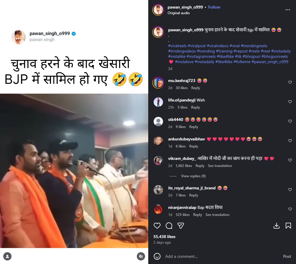 वहीं, जब हमने वायरल वीडियो की पड़ताल की तो ये बात सामने आई कि ये वीडियो काफी पुराना है, जिसे बिहार विधानसभा चुनाव के बाद फिर से वायरल किया जा रहा है। पड़ताल के दौरान हमने खेसारी लाल यादव के इंस्टाग्राम अकाउंट को चेक किया तो पाया कि उन्होंने दो दिन पहले एक वीडियो शेयर किया था, जिसमें बिहार की जनता को धन्यवाद दिया था। वहीं, जिस आईडी से इस वीडियो को शेयर किया गया वो पवन सिंह के फैन की आईडी है ना कि ओरिजनल आईडी।