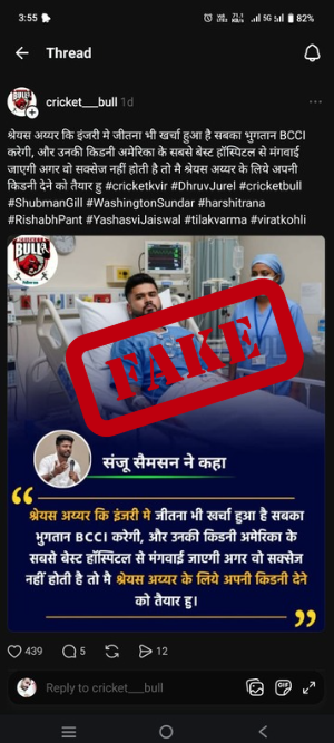 वहीं, जब इस वायरल दावे की पड़ताल की गई तो कुछ और ही बात निकलकर सामने आई। हमने श्रेयस अय्यर का सोशल मीडिया अकाउंट चेक किया तो उन्होंने 30 अक्टूबर 2025 को अपने अधिकारिक एक्स अकाउंट पर सुबह करीब 9 बजे एक पोस्ट करते हुए कहा है कि “मैं अभी रिकवरी प्रोसेस में हूं और हर गुजरते दिन के साथ बेहतर हो रहा हूं। मुझे जो शुभकामनाएं और समर्थन मिला है, उसे देखकर मैं बहुत आभारी हूं। यह मेरे लिए सचमुच बहुत मायने रखता है। मुझे याद रखने के लिए धन्यवाद।” ऐसे में संजू सैमसन के बयान का हवाला देते हुए किया गया पोस्ट पूरी तरह गलत है।