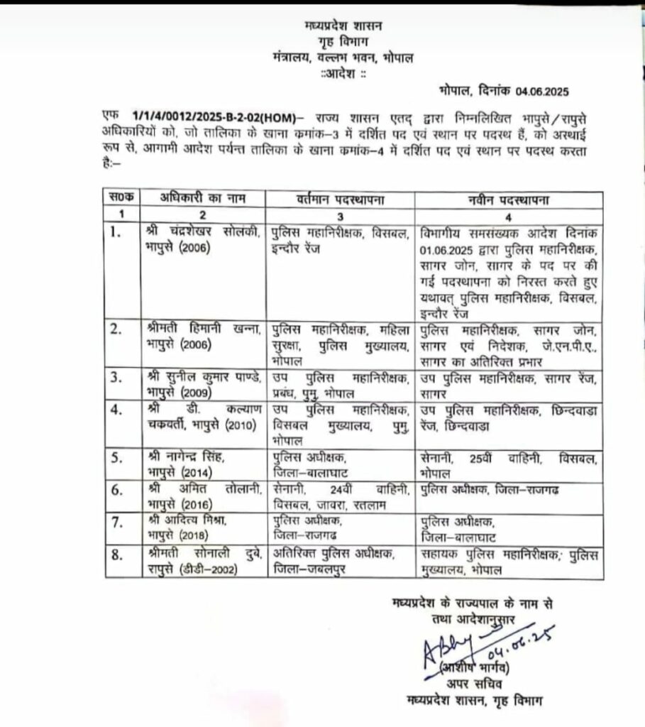 IPS Transfer: प्रदेश में 8 IPS अधिकारियों का तबादला, हटाए गए बालाघाट SP नागेंद्र सिंह, देखें सूची