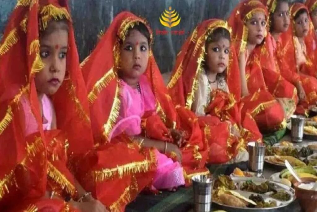 नवरात्र में सभी तिथियों को एक-एक और अष्टमी या नवमी को नौ कन्याओं की पूजा होती है। दो वर्ष की कन्या (कुमारी) के पूजन से दुख और दरिद्रता मां दूर करती हैं। तीन वर्ष की कन्या त्रिमूर्ति रूप में मानी जाती है। त्रिमूर्ति कन्या के पूजन से धन-धान्य आता है और परिवार में सुख-समृद्धि आती है। चार वर्ष की कन्या को कल्याणी माना जाता है। इसकी पूजा से परिवार का कल्याण होता है। जबकि पांच वर्ष की कन्या रोहिणी कहलाती है। रोहिणी को पूजने से व्यक्ति रोगमुक्त हो जाता है। छह वर्ष की कन्या को कालिका रूप कहा गया है। कालिका रूप से विद्या, विजय, राजयोग की प्राप्ति होती है। सात वर्ष की कन्या का रूप चंडिका का है। चंडिका रूप का पूजन करने से ऐश्वर्य की प्राप्ति होती है। आठ वर्ष की कन्या शाम्भवी कहलाती है। इनका पूजन करने से वाद-विवाद में विजय प्राप्त होती है। नौ वर्ष की कन्या दुर्गा कहलाती है। इसका पूजन करने से शत्रुओं का नाश होता है तथा असाध्य कार्यपूर्ण होते हैं। दस वर्ष की कन्या सुभद्रा कहलाती है। सुभद्रा अपने भक्तों के सारे मनोरथ पूर्ण करती है।
