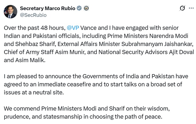 वहीं यूएस के Secretary Marco Rubio ने ट्वीट कर कहा है कि पिछले 48 घंटों में, @वीपी वेंस और मैंने वरिष्ठ भारतीय और पाकिस्तानी अधिकारियों के साथ बातचीत की है, जिनमें प्रधान मंत्री नरेंद्र मोदी और शहबाज शरीफ, विदेश मंत्री सुब्रह्मण्यम जयशंकर, सेना प्रमुख असीम मुनीर और राष्ट्रीय सुरक्षा सलाहकार अजीत डोभाल और असीम मलिक शामिल हैं।