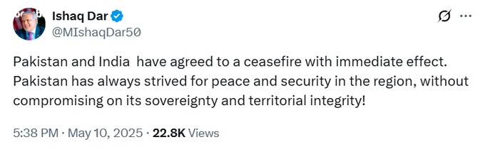वहीं, पाकिस्तान के उप प्रधानमंत्री और विदेश मंत्री इशाक डार ने सोशल मीडिया पर जानकारी दी कि भारत और पाकिस्तान ने तत्काल प्रभाव से संघर्ष विराम पर सहमति जताई है। उन्होंने कहा कि पाकिस्तान ने हमेशा क्षेत्र में शांति और सुरक्षा के लिए प्रयास किए हैं, अपनी संप्रभुता और क्षेत्रीय अखंडता से समझौता किए बिना।