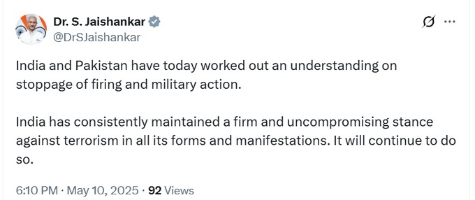विदेश मंत्री डॉ. एस जयशंकर ने ट्वीट किया, “भारत और पाकिस्तान ने आज गोलीबारी और सैन्य कार्रवाई रोकने पर सहमति बनाई है। भारत ने आतंकवाद के सभी रूपों और अभिव्यक्तियों के खिलाफ लगातार दृढ़ और समझौता न करने वाला रुख बनाए रखा है। वह ऐसा करना जारी रखेगा।”