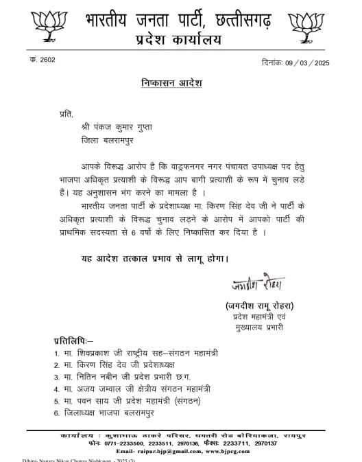 - बलरामपुर के पंकज गुप्ता BJP से 6 साल के लिए निष्कासित