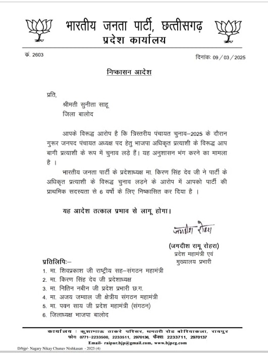 बालोद जिला में गुरूर जनपद अध्यक्ष पद के लिए बागी होकर चुनाव लड़ने वाली सुनीता साहू को 6 साल के लिए निष्कासित कर दिया है। वहीं एक अन्य जारी आदेश में बलरामपुर जिला वाड्रफनगर नगर पंचायत उपाध्यक्ष के लिए बीजेपी के अधिकृत प्रत्याशी के विरूद्ध बागी होकर चुनाव लड़ने वाले पंकज कुमार गुप्ता को पार्टी ने 6 साल के लिए निष्कासित कर दिया है।