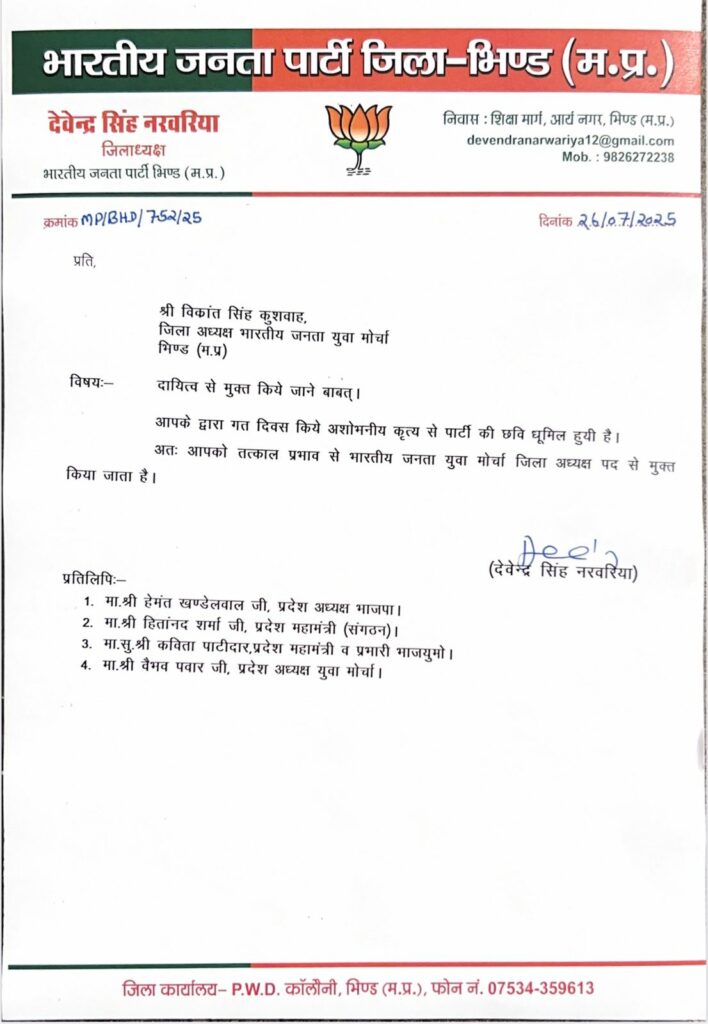 उस लेटर में हवाला दिया गया है कि भारतीय जनता पार्टी युवा मोर्चा के जिला अध्यक्ष विक्रम सिंह कुशवाहा को पद से इसलिए हटाया जाता है कि उनका सार्वजनिक स्थल पर शराब के नशे में धुत्त होने का वीडियो वायरल हुआ था। इस वीडियो में वह बस के ऊपर पेशाब कर रहे हैं, इस वायरल वीडियो से भारतीय जनता पार्टी की छबि धूमिल हुई है। यह एक अशोभनीय कृत्य है इसलिए विक्रांत सिंह कुशवाहा युवा नेता भारतीय जनता पार्टी को पद से हटाया जाता है।