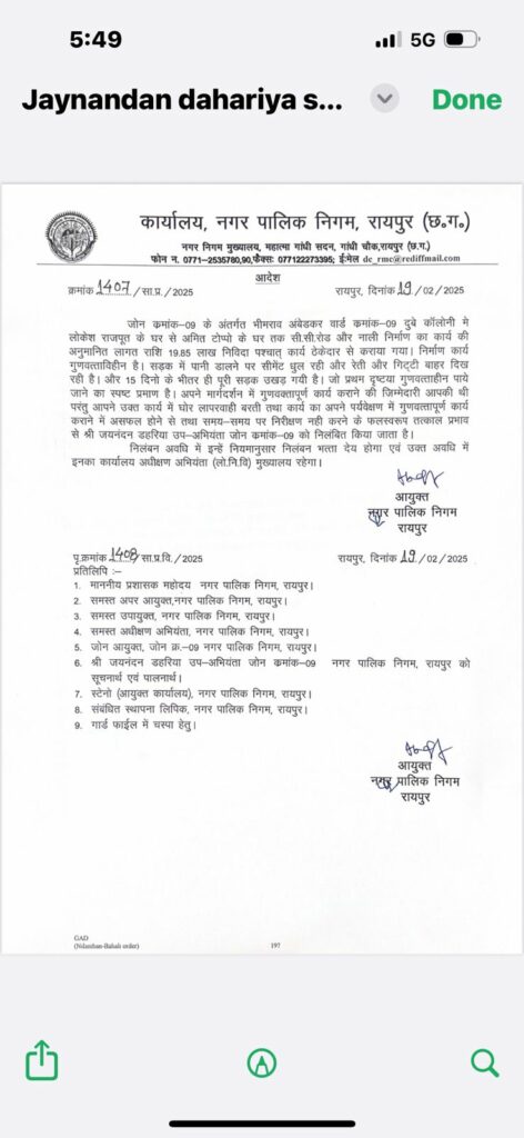 IBC24 exposed big corruption: नगर निगम आयुक्त अबिनाश मिश्रा ने भ्रष्टाचार के खिलाफ सख्त कार्रवाई करते हुए जोन 9 की सब-इंजीनियर रुचि साहू और जयनंदन डहरिया को तत्काल प्रभाव से निलंबित कर दिया है।