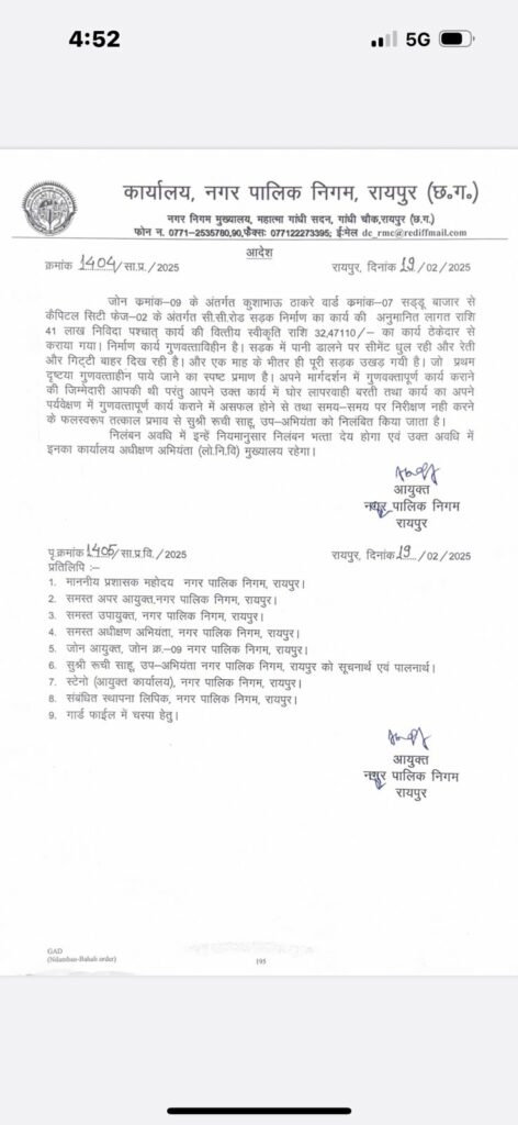 नगर निगम आयुक्त अबिनाश मिश्रा ने भ्रष्टाचार के खिलाफ सख्त कार्रवाई करते हुए जोन 9 की सब-इंजीनियर रुचि साहू और जयनंदन डहरिया को तत्काल प्रभाव से निलंबित कर दिया है। रुचि साहू और जयनंदन डहरिया के साथ साथ सहायक अभियंता ओपी वर्मा के खिलाफ डिपार्टमेंटल इंक्वायरी शुरू करने के आदेश दिए गए हैं। वहीं ठेकेदारों के खिलाफ कड़ी कारवाई की जाएगी।