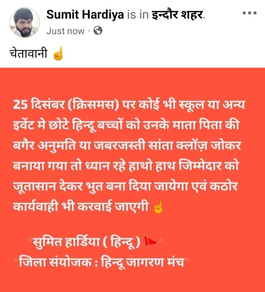 हिंदू जागरण मंच का विवादित पोस्ट (Indore Santa Claus warning)